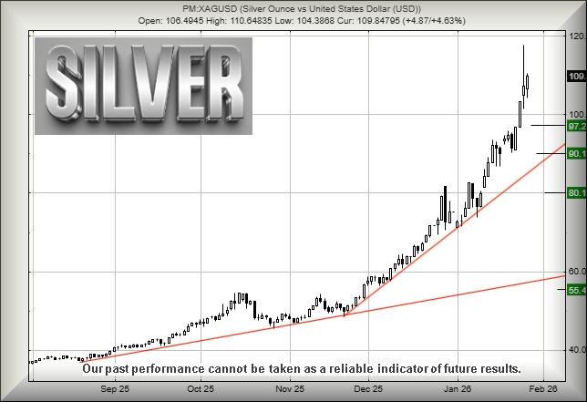 From our obscure arithmetic perspective, GOLD now needs close a day above 4,783 dollars an this now risks suggesting ongoing gains to an initial 4,872 dollars. Our secondary, if this target is exceeded, now calculates at $5,200 and a pretty solid nod above the 5k level. It’s perhaps important to mention we cannot calculate above $5,200 and suspect achieving such a level shall introduce some volatility. However (this is important) if the market starts nudging the price of the metal up with little gaps at the open (such as occurred twice recently – circled) could easily ensure our 5,200 dollar ambition may prove to be another footnote in the price of Gold.