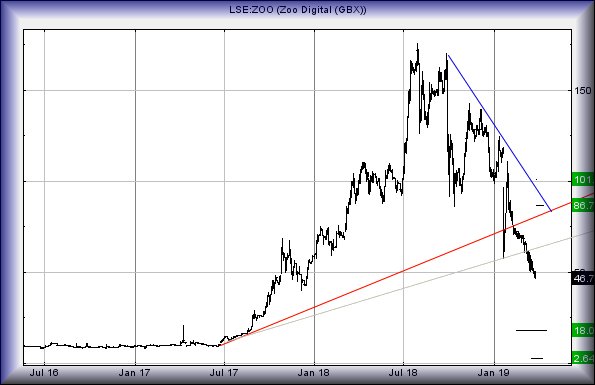 There is always the temptation to try and pick bottom with shares and Zoo, presently, are flirting with some very real danger. At time of writing, the share is trading around 46.75p. From our perspective, it dare not break below 45.5p as this risks uncovering a painful scab, a move with greater potential for self harm than we’d expect. For the purposes of certainty (or as close to such as the market allows) we shall demand closure below 45.5p as providing breakage of the final straw but to be realistic, alarm bells would now ring if this trades an iota below 45.5p.