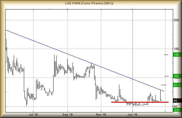 Which brings me neatly to Faron Pharmaceuticals. They are, after all, in the cancer trade but surprisingly, price movements suggest this is a pretty dangerous share to play with. When last reviewing it, we warned of the danger should the price manage to close a session below 57p. The given implication would be our ‘bottom’ calculation could be broken and therefore we could no longer calculate how far down it could fail. Unfortunately, not only did it close just below 57p, the share price has spent a couple of months flirting just below the 57p level and it was only in February did it recover just above this level. Thus, there is no doubt the drop level was indeed valid and equally, it appears the market has acknowledged this. We’ve painted a thick RED line on the chart at the 57p level.