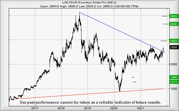The immediate situation for Fevertree appears pretty straightforward, above 2700p suggesting further price movement to an initial 2950p. If bettered, life gets more interesting as our longer term secondary calculates at 3640p. Unusually, we can also provide a 3rd level ambition at 3958p, virtually identical to their previous all time high 3 years ago.