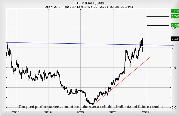 Their share price has just achieved a new, all time high, quite a big deal when viewed against the background of the Italian stock market. Closing Tuesday at 2.28€, the share price is nibbling at the edge of further considerable strength for the longer term, requiring closure above just 2.33€ to force us to regard a new cycle as beginning. In fact, even near term trades exceeding 2.37, the high of Tuesday, should give early warning for some useful traffic ahead.