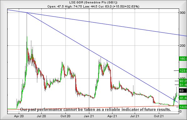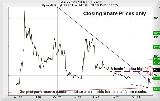 The reason we’re somewhat flippant is simple. The share price has achieved a high of 74.75 and closed a session at 63p. As the chart for the last year highlights, the price is now above the immediate downtrend and also is trading higher than at any point since June. We’re great fans of Higher Highs and feel a chart, unadorned with colourful technical indicators, should be give sufficient information to those who fail to understand technical indicators. We’ve shown two identical charts below, the upper one focussed on the level at which the share price closed. The lower one is decorated with colourful candles and the important thing is straightforward. Both charts give an impression of a share price which looks very capable of future gains for this established molecular diagnostics company.