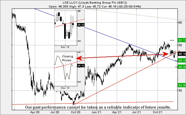Lloyds Bank (LON:LLOY) As for Lloyds, we can be brief. Our criteria three weeks ago proposed an argument for reversal to 44.6p. This level was achieved and even broken. As a result, we’re inclined toward a degree of misery in speculating what’s coming next. The price now needs break 44.3p to trigger reversal to an initial 43.16p with secondary, if (or rather when) broken at a bottom of 40.3p. Overall, Lloyds share price is now trading in a region where we calculate an ultimate bottom of 32p has become possible. It’s probably important to view the inset on the chart below. The upper inset with candles shows the share price appears to exceed the immediate Red uptrend. The lower inset, the closing price, shows the market took exquisite care to avoid the price closing a session in safety.