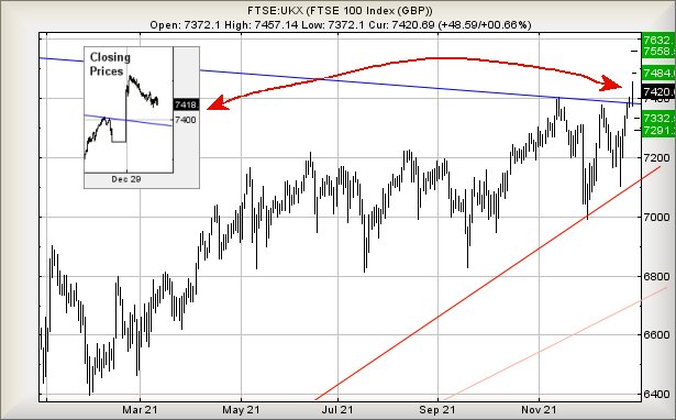 Festive grump aside, the FTSE looks capable of finishing the year in fairly useful territory as we head into the final full session. Already at a high, following the 2020 Covid plunge, the index need only exceed 7459 to suggest coming movement to 7484 points. If exceeded, our secondary calculates at an amazing (and less likely) level of 7558 points. Such an ambition matches, almost exactly, the pre-Covid-19 high of 7547 points in February 2020, and would provide a real cliff-hanger upon which to finish the year.