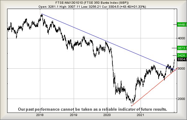 Near term, above 207.5p should now make an attempt at 218p next. We’re already pretty certain the bank share price intends a visit to this level. Closure above 218p should prove interesting, allowing a visit to a future 240p. It’s the 240p level we suspect shall prove capable of some grief, probably matching our ambition of 3,673 or so for the Banking Sector.