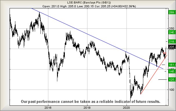 If things intend go pear shaped, the bank currently needs trade below 175p to generate a serious level of concern. Our inclination is to remain viewing Barclays favourably, at least until 240p makes an appearance. Goodness knows how long it may take!