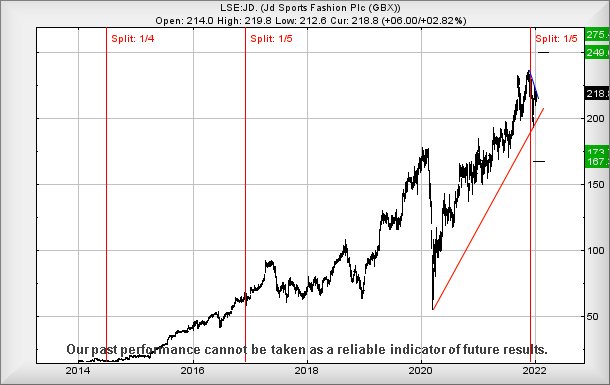 JD Sports first played this game in 2014, issuing 4 shares for every existing share. This quartered the share price. Two years later in 2016, they issued 5 shares for every existing share, diluting the price by 80%. Once again, as 2021 drew to a close, the share price was again returned to sensible levels, a further 5 shares issued for each existing share. Unless our calculations are horribly wrong, the “true” value of JD Sports would work out around 60 quid per share, if measured in pre-2014 money. As the chart below highlights, on each occasion JD Sports diluted the number of shares in issue, the share price has gone from strength to strength and this perhaps allows considerable optimism.