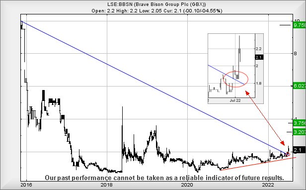 The company share price has proven pretty stagnant for the last few years but now, is starting to give early signs “something” may be happening. We’ve shown an inset on the chart below, the share price breaking though a long term downtrend by the market opting to ‘gap’ the price up. For 5 sessions, exquisite care was taken to ensure the share price didn’t fall below the point of trend break at 1.85p. Logic tends suggest the market has plans for the future and with the share currently trading around 2.1p, Brave Bison doesn’t need stretch its legs too hard to get the price moving.
