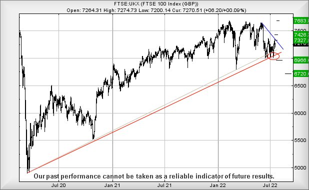 Circled on the chart below, a movement the FTSE made a few weeks ago, where during the session the index explored life below the Red uptrend since 2020. But importantly, the session closed without the value of the index below Red. As mentioned previously, we regard this sort of thing as a warning for impending trouble and in the case of the FTSE, rather than rushing out an opening a blind short position, it’s perhaps worth considering thinking about things.