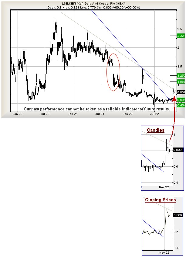 Kefi are managing to provide a brief “Back to School” lesson about trend lines. An immediate glance at the Big Picture chart below gives ample reason for good cheer for the share price future, it has broken through a pronounced Blue downtrend since 2016 and is now clearly heading upward. Surely this gives reason for rampant optimism for the months ahead?