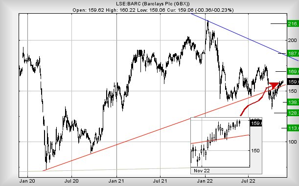 The simile with the famed John Cleese sketch, giving his car a good thrashing with a branch, popped to mind while this uncooperative pine tree was being swung against an innocent beech tree as we knew we were writing about Barclays. Three weeks ago when we covered the share, our first criteria was a scenario where above 155p should trigger movement to 160p initially. The last week saw this ambition attained, their share price reaching a magnificent 160.22p twice! The price clearly needs a good thrashing…