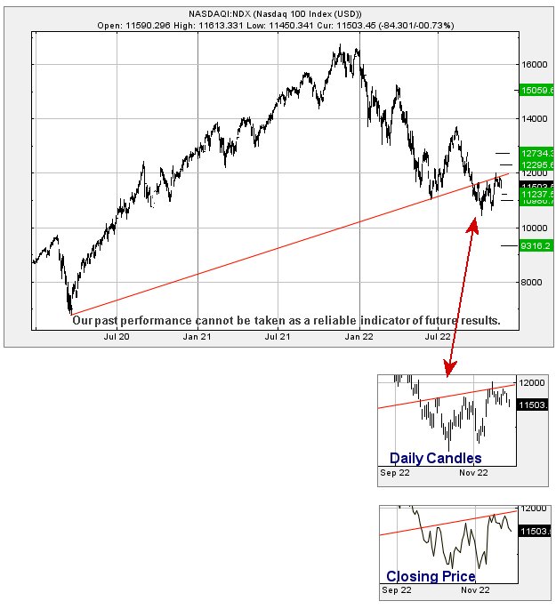 The chart below has a couple of extracts, giving Nasdaq price movements since September. For reasons known only to the gods of the market, the Nasdaq has not yet closed above the prior Red trend, instead carefully assigned a place mumbling along just below the Red trend line. This sort of behaviour, while defying logic, comes with a pretty confident promise.