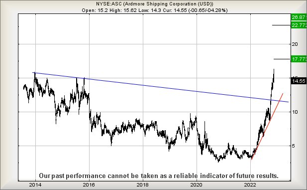 Thankfully with no visible link to Scotland, Ardmore Shipping commenced 12 years ago, creating a new shipping company carrying chemicals and other products via their own fleet of tankers. Anyone who enjoys looking at pictures of tankers is advised to visit the corporate website. They appear proud of their fleet, described as the most modern in the industry. Their share price appears to justify some confidence as it’s currently trading at an all time high, requiring very little effort to once again climb higher.