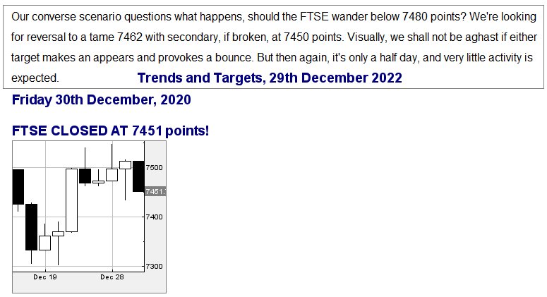 The final session of 2022 provided ample opportunity for us to dislocate a shoulder, trying to administer a pat on the back. Our scenario, the previous day, allowed for reversal to 7450 points and with London wrapping things up for the year at 7451 points, this was deemed close enough for self congratulations as we were out by 13 thousands of a percent. As always, New Year in Scotland was pretty boring with things only becoming interesting when friends dropped round the following day.