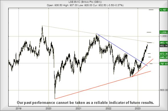 Importantly, from a Big Picture perspective, closure above 953p should prove important, allowing the share price to fizz upward to an eventual 1030p sometime in the future, doubtless once again experiencing some hesitation due to previous share price behaviour. However, with closure above 953p, we shall regard a distant 1197p as exerting a long term attraction for the share and a new all time high.