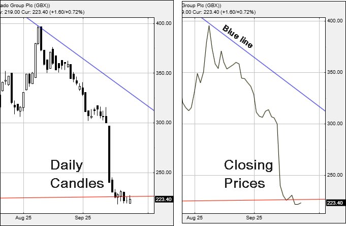 Ocado Group enjoy a Red uptrend since 2013 and movements in the last few sessions tend indicate the market it perfectly aware of the pretty red line. The share price has now slithered below Red, indicating the share price is just a bad news story away from trouble. The chart extracts below highlight the reason for our concern, early days but no less dangerous. Thankfully, the share price need only close above 229p to greatly alleviate our concern.