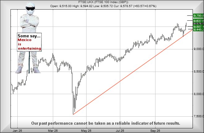 #FTSE #WallSt This weekends Grand Prix is one of our favourites, Mexico. One of the bigger attractions, aside from some decent racing, will be the excuse for Mexican food on Sunday during the race, though we’ll resist knocking back Tequila every time the most successful Mexican Formula 1 driver, Sergio Perez, (who isn’t racing) is mentioned. Unfortunately, the biggest problem locally with Nacho’s is finding the right cheese, as Argyll outlets tend eschew the idea of stocking Monterrey Jack and Fontina. Invariably, we end up using Cheddar…