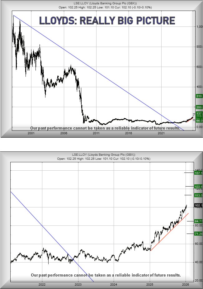 Blue on the chart delineates a downtrend since April 1998. If we extend this downtrend to the current period, it seems Lloyds share price needs dwindle below 40p to indicate the onset of trouble. Otherwise, a quite fascinating scenario exists and if we pretend this Big Picture is important, apparently above 104p should – for the terminally patient – suggest a cycle has commenced to a future 200p with our LONG term secondary, if bettered, at 316p. In fact, we can calculate quite a bit higher but dreams of Lloyds turning into an 8 quid share are probably best left on the shelf.