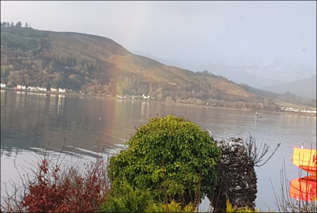 Finally, the photo below was taken here in Argyll at 8am on Monday. In the distance, the misty mountains are snow covered, the sea was glass calm, the temperature -1c, and the quartz arch in the front garden was graced with a rainbow illuminating the ivy. Needless to say, by 3pm, it was raining again!
