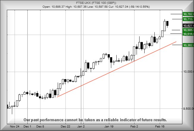 In our usual alternate scenario, the FTSE needs exceed 10,672 points to trigger a visit to an initial 10,713 points. Our ‘longer term’ secondary, if this initial is exceeded, calculates at 10,782 points.
