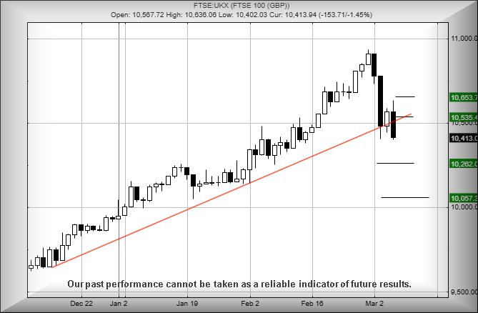 On Tuesday March 3rd, the FTSE achieved a low of 10406. On Thursday March 5th, it achieved a low of 10402. Thus, a lower low was created, a concept solidified by the FTSE closing at 10414 points, solidly below the immediate uptrend. To us, the implication is to anticipate further reversals in the days ahead.