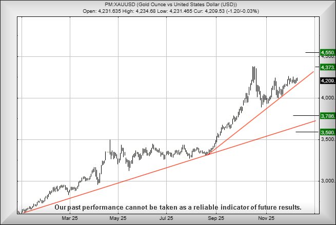 Apparently, now above $4260 should trigger gains to an initial 4373 dollars with our longer term secondary, if bettered, an all time high of $4556 and residency at the edge of irrational Bitcoin territory. We suspect Gold intends dig itself uipward.