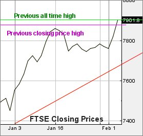 We always make a big deal about “higher highs” but the FTSE is posing an interesting question, one where our inclination is to retreat to our usual demand to see prices close higher than previous levels. Once upon a time in May 22nd, 2018, the FTSE had a day high of 7903.5 points. Last Friday, 5th February, the FTSE had a day high of 7906.58.