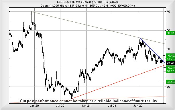 What if Lloyds share price is driven by our mythical BMW pilot, opting to indicate right while veering to the left for the exit lane! Or in plain English, behaves just like a real share price in the UK stock market. We’re going to play relatively safe here, suggesting below 41.4p will not prove traumatic, breaking the Red uptrend since the pandemic low of 2020. Movement such as this risks triggering reversal to an initial 40.2p with secondary, when broken, at 38.2p and hopefully a proper bounce, if only due to sufficient number of folk assuming the price must rebound when it matches the “Russia Drop” of earlier this year. From a bigger picture perspective, we fear this would not be the case as a solid argument exists demanding it bounce from 32.5p eventually, should this scenario come to fruition.