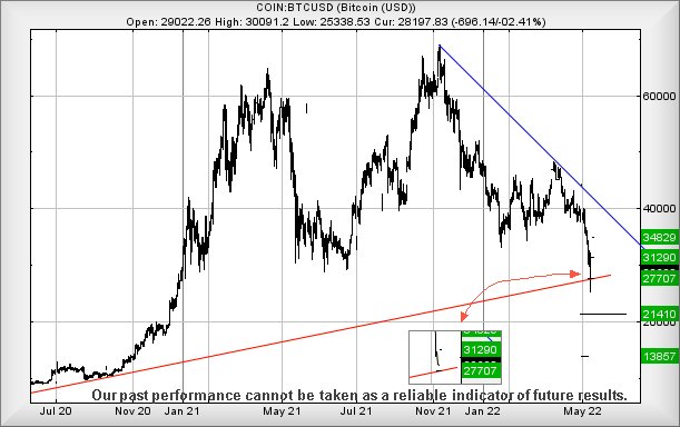 The immediate Bitcoin chart is, at first glance, quite interesting. On Thursday 12th May, the crypto broke the uptrend since 2020, attaining a bottom around $25,300 when the days session effectively opened at 8am. We’d been showing a Big Picture drop target around 27,700 on the current cycle and this, quite precisely, appeared to mesh with the Red uptrend. While the spike down early in the day to a low of 25,300 indeed broke the trend, the damage was undone by 8.45am.