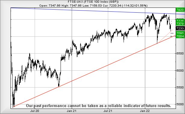 FTSE for Friday Yet again, we’re stumbling into a Friday feeling uncertain as to just what the heck is going on. It’s supposed to be the case of weakness below 7158 points now generating reversal to an initial 7090 points with secondary, if broken, a hopeful bottom at 7004 points. Unfortunately, there’s quite a strong visual case demanding a bottom at the 7004 point level, thanks to the presence of the Red pandemic trend line. This almost jars with a nice letter received today from Scotland’s fragrant Nicola Sturgeon, effectively letting me know the pandemic shall be deemed “over” from the end of this month, thanks to plentiful supply of treatments for anyone experiencing Covid-19. But personally, not to worry as I remain at the top of the list for any future vaccination campaigns.