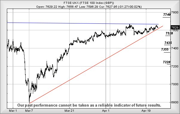 The immediate chart below reviews minute by minute movements on the FTSE, since the start of March. Visually, it’s pretty clear things have proven fairly tepid since the start of April, the market effectively flatlining. The previous high on the FTSE was 7688 points, achieved on February 10th, and the market has yet to attempt to exceed such a level. To be fair, there’s a heck of a strong argument demanding the FTSE head to 7740 points next, if only the index would wander above the Blue line on the chart. At time of writing, this Blue level is at 7637 points and we shall prove as attainable as a UK politician telling the truth. To be blunt, the closer the index approaches the trend, the greater the chances of the market opting to react in a negative fashion. Hence, our suspicion we need to check drop triggers.