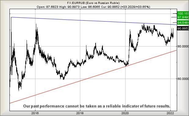 The other storm providing a worry, obviously, is the current Russia/Ukraine thing. A complete distrust of the media, thanks to the playground “fight, fight” rhetoric so prevalent in the UK, suggested it may prove a safer exercise to review how the markets are handling the currency relationship between Europe and Russia. Thankfully the picture, while interesting, isn’t screaming drama. The immediate situation suggests above 90.9 looks capable of allowing the Euro to strengthen to an initial 94.54, such an ambition challenging the prior highs of 2020. Should such a level be exceeded, our secondary calculation comes along at 97.94 and again, this suggests a visual challenge against the strange high of 2014.