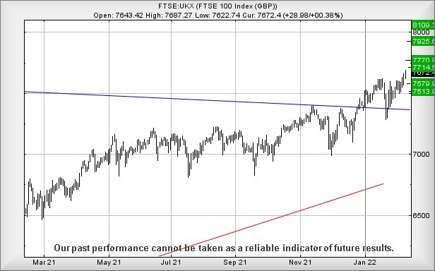 Witnessing a day, where the FTSE yet again did well despite a backdrop of the Nasdaq down 2.3%, Wall St down by 1.5%, France down and Germany flat, the UK market has continued to excel in the initial optimism which followed the pre-pandemic high being exceeded. Unfortunately, the market is now facing the next major hurdle. It closed Thursday at 7672 points, marginally below the previous high in January 2020 of 7674 points. We’d be comfortable Friday would again experience gains, if the UK index had just managed a few points higher. However, the visual implication given by this behaviour may be of slight nerves in the market place. Even the day high, at 7687 points, proved slightly below the previous high on the Blue trend at 7689 points. Perhaps we’re being a little pedantic but we’re more than a little curious as to what level the FTSE shall run out of steam, while it catches up with the previously flamboyant nature of other markets in the world.