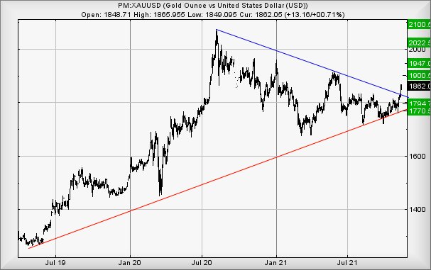 GOLD (PM:XAUUSD) We’ve received a few emails, asking for a further update on Gold, despite it being covered last week. The reason for the flurry is fairly simple; we’d given a trigger level at $1,873 and the metal achieved a high of 1,877 on Tuesday before retreating to close the day at 1,850 dollars. This sort of thing is always a worry, hence our often repeated demand a market actually CLOSE a session above a target level to give a belt and braces signal which confirms movement potentials. Instead, for the present, about the best we can hope is our 1,873 level shall prove valid until such time the market stops circling below the trigger level and once again, breaks the surface.