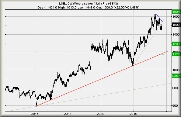 For now, we’re not terribly confident as the share has broken through this years uptrend. Despite recent gains, we’d be worried should it break below 1445p as reversal down to an initial 1293p makes sense. If broken, secondary calculates at 1178p, essentially meeting the uptrend since 2016 and the Brexit vote. Rather fitting, given JDW’s Beermats & Brexit drama.