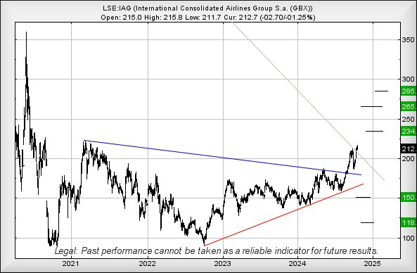 LSE:IAG British Airways. Close Mid-Price: 215.4 Percentage Change: + 0.61% Day High: 217 Day Low: 213.4