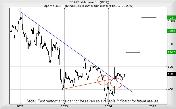 At first glance, it was easy to assume happy days were ahead for M&S, aside from a small but perhaps crucial detail. We often reiterate our demand a share price actually close at or above a specific level to give an accurate clue as to what the future holds. The circled area on the chart below highlights our issue as M&S closed at 290.5p at that point. Now, despite breaking through the downtrend, it noticeably failed to close above this prior high, ending the session at 288p. As a result, we’re not confident with the immediate projections as this sort of thing is rarely a mistake by trading software.