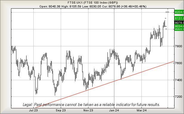 24/04/2024 FTSE Closed at 8040 points. Change of -0.05%. Total value traded through LSE was: £ 8,038,861,258 a change of 24.9%