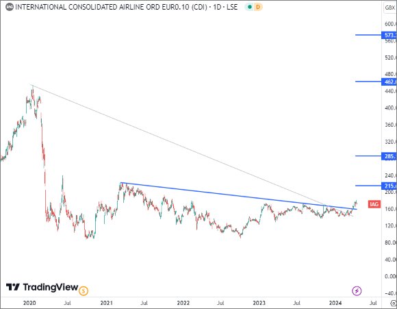 The share price is starting to show early signs of coming awake, makes us wonder if it’s going to be one of the prices which proves capable of making some sort of attempt at pre-pandemic levels. To be fair, we’d anticipated the Travel and Holiday sectors to move rather faster than has been shown, even Food and Clothing proving earlier on the steps for recovery. However, with jet engine maker Rolls Royce soaring substantially higher than their pre-pandemic price level of 240p and currently just over 4 quid, we’re inclined to attach some hope for the airline sector playing catchup at some point, perhaps fairly soon. IAG’s share price is now trading higher than any level since 2021 and has also broken through the solid Blue downtrend since 2021, in addition to breaking above a less certain downtrend since 2020.