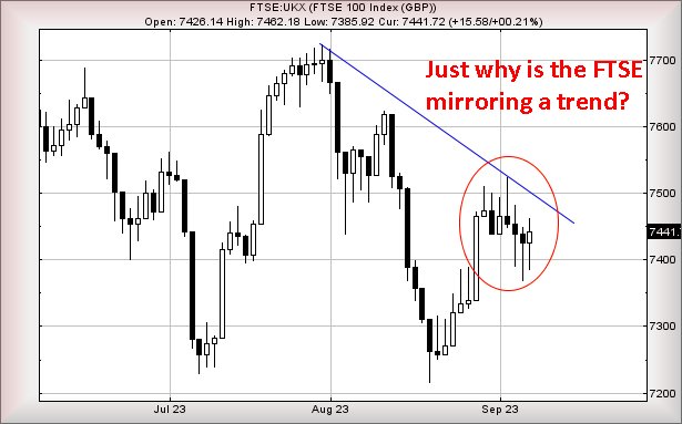 #FTSE #GOLD The weather has been causing problems with the markets. Or perhaps not, it just seems everything else is being blamed! Currently, the FTSE is exhibiting a strange series of movements we’re more inclined to assign to tightly controlled AIM shares. In the absence of a catchy phrase, we call this “Reacting to a trend from afar”. Whatever that means!