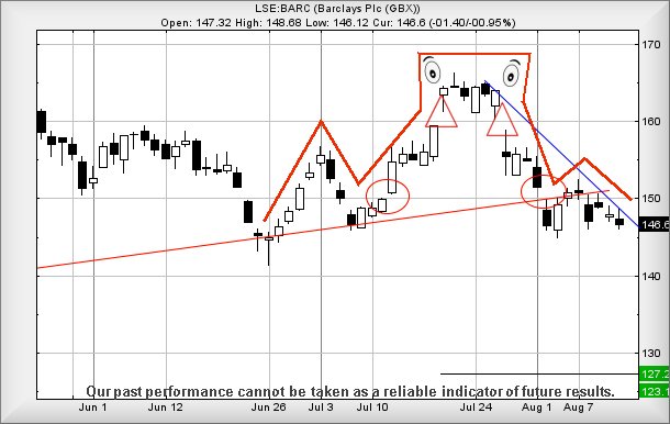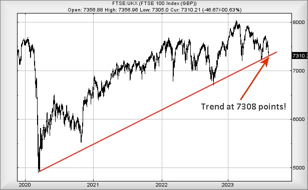 If ‘the market’ is indeed paying attention to this Red uptrend, the implication from such precise behaviour is to anticipate a bounce on the FTSE, working on the basis the summertime temps have been told not to break Red on the chart. Or maybe it’s just the case the market is exhibiting its renowned sense of humour?