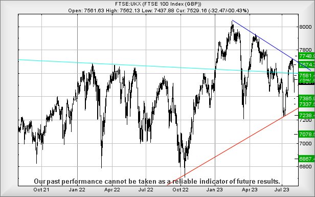 7/08/2023 FTSE Closed at 7554 points. Change of -0.13%. Total value traded through LSE was: £ 3,501,608,401 a change of -4.09%